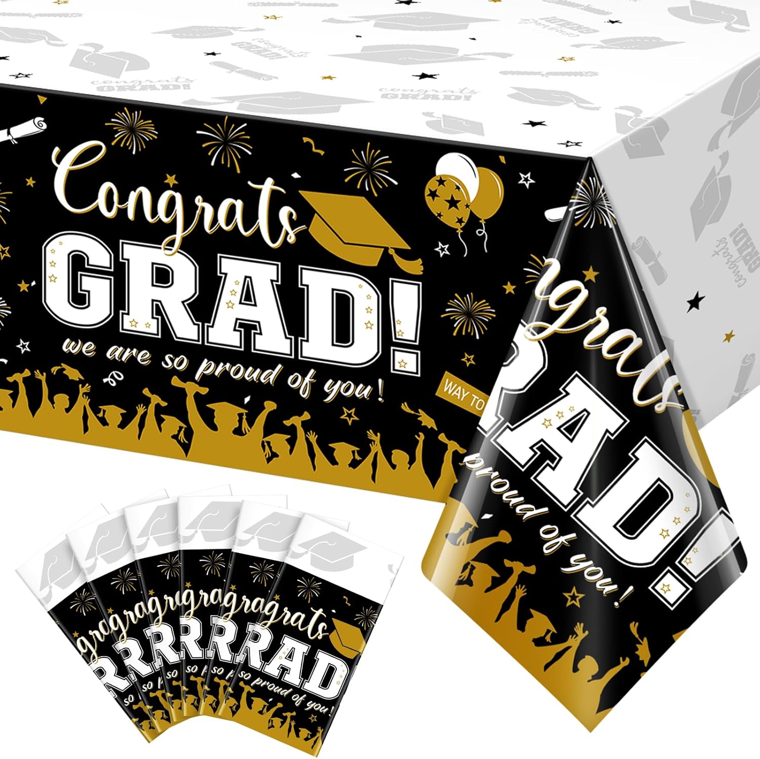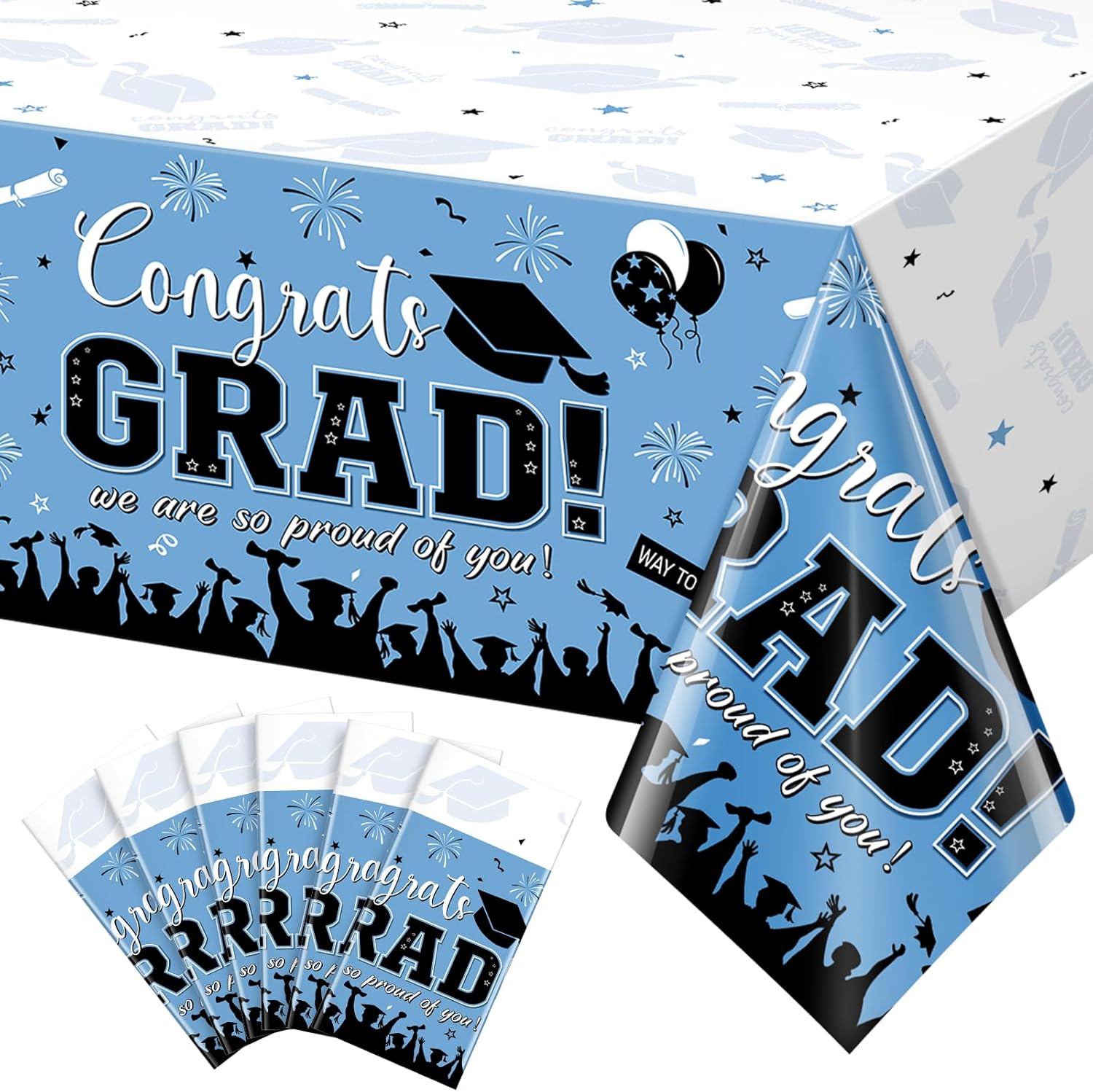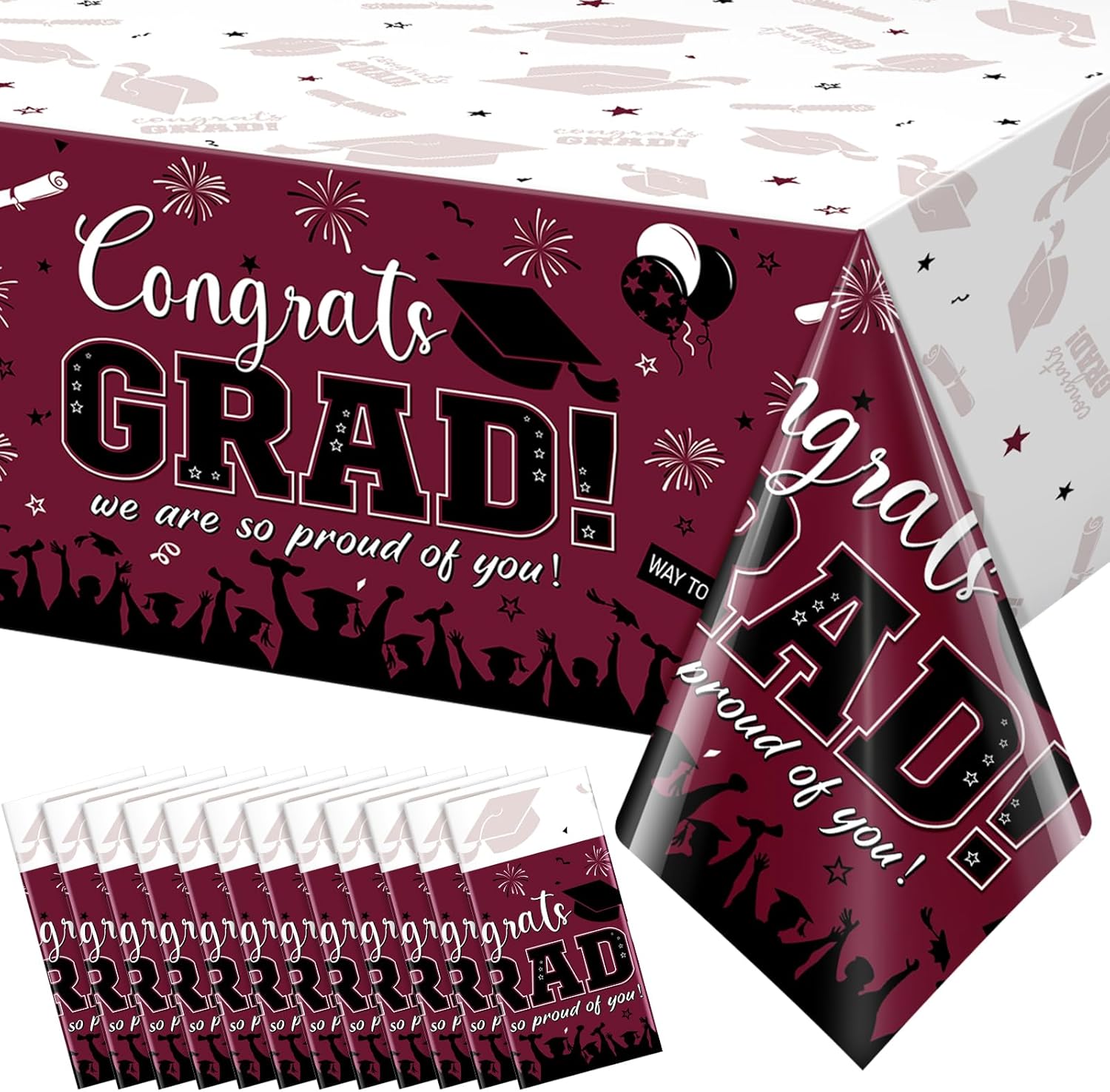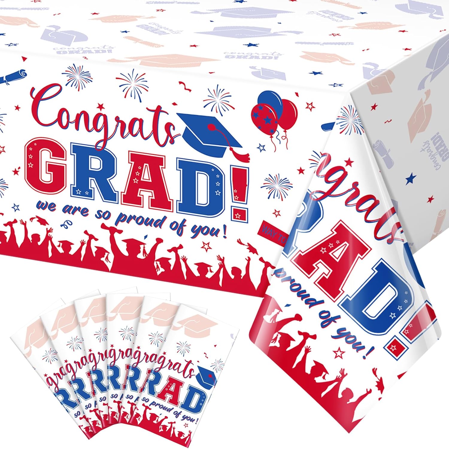 Features: Graduation Party Decorations Our graduation plastic tablecloth features a classic red and blue color and is printed with messages such as "Congrats GRAD," and "we are proud of you," as well as patterns such as mortarboards and folded diplomas, making it the perfect centerpiece for your graduation party. Versatile Uses: Our graduation decorations aren't just limited to being used as tablecloths - they can also be used as graduation party wallpaper, photo backdrops, and other party decorations to add more color to your graduation party and create beautiful memories. They're suitable for graduation celebrations of all levels, including kindergarten, elementary school, middle school, high school, and college. Specifications: Package includes: 12 x Graduation Plastic tablecloths Material: Plastic Color: Red and Blue Size: Approx 54 x 108 inches Notes: Manual measurement, please allow slight errors in size. The color may exist a slight difference due to different screen displays. Please stay away from fire.
