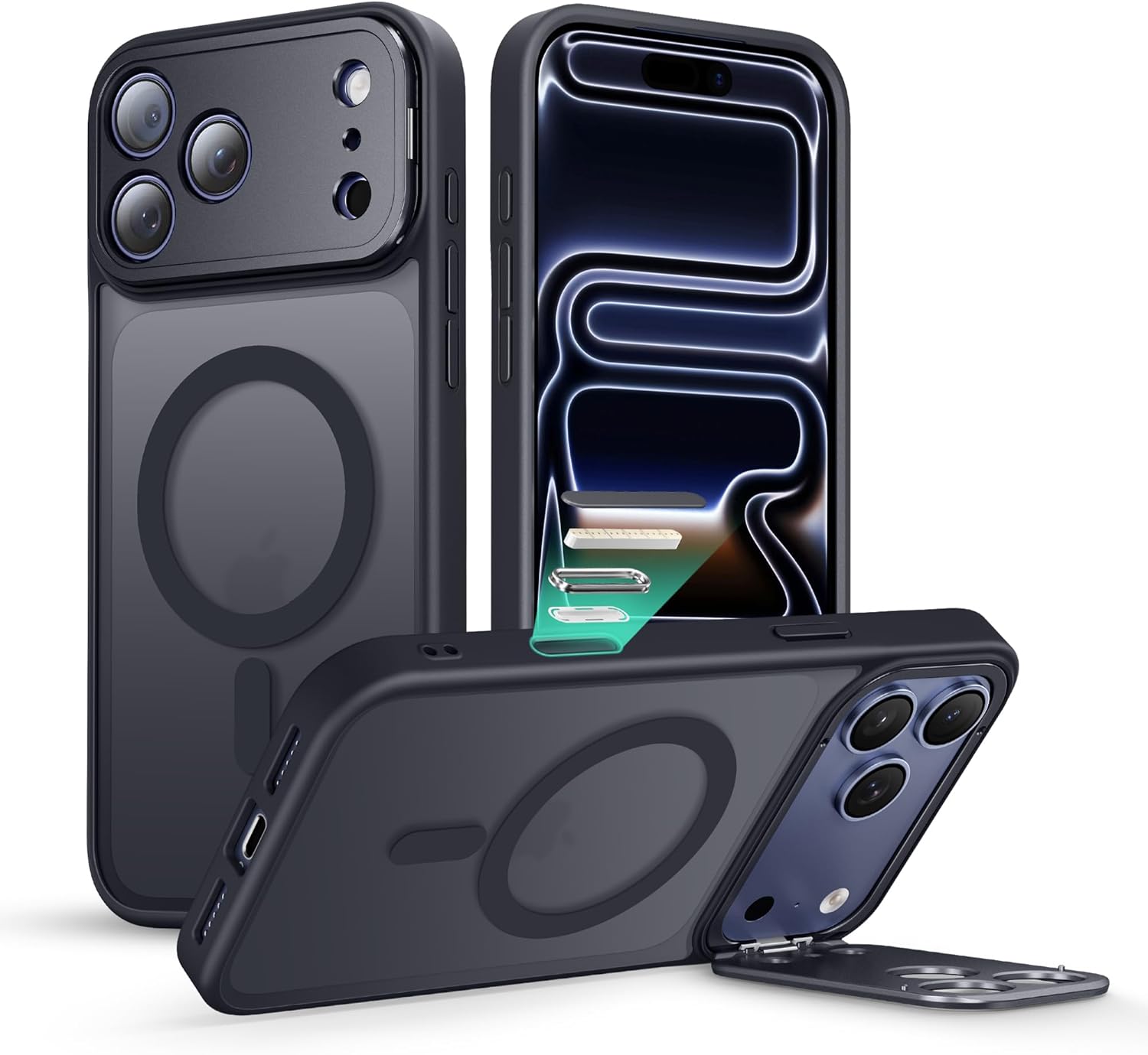 [All-in-One Camera Guard & Adjustable Stand] The raised bezel provides 360° lens protection, while the built-in foldable stand offers hands-free viewing at any angle. The low-profile design stays hidden when not in use, without blocking magnetic functionality. Perfect for watching videos, video calls, or propping up your phone on the go