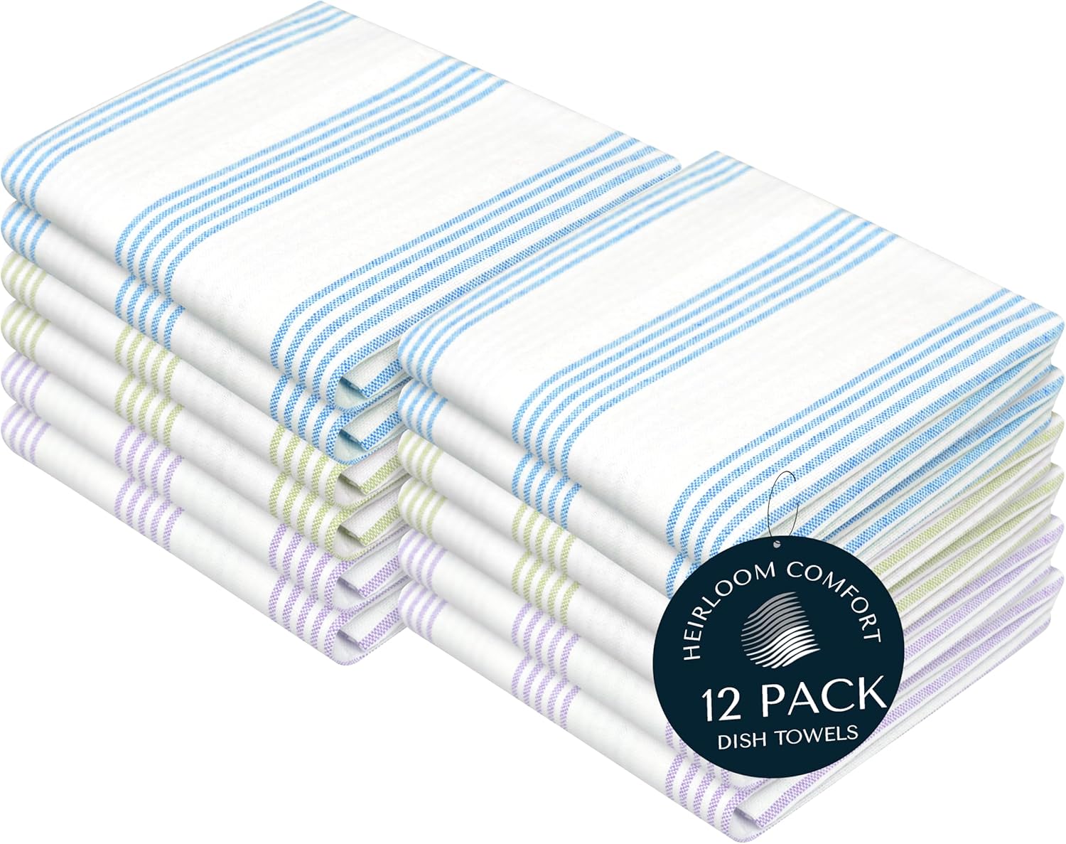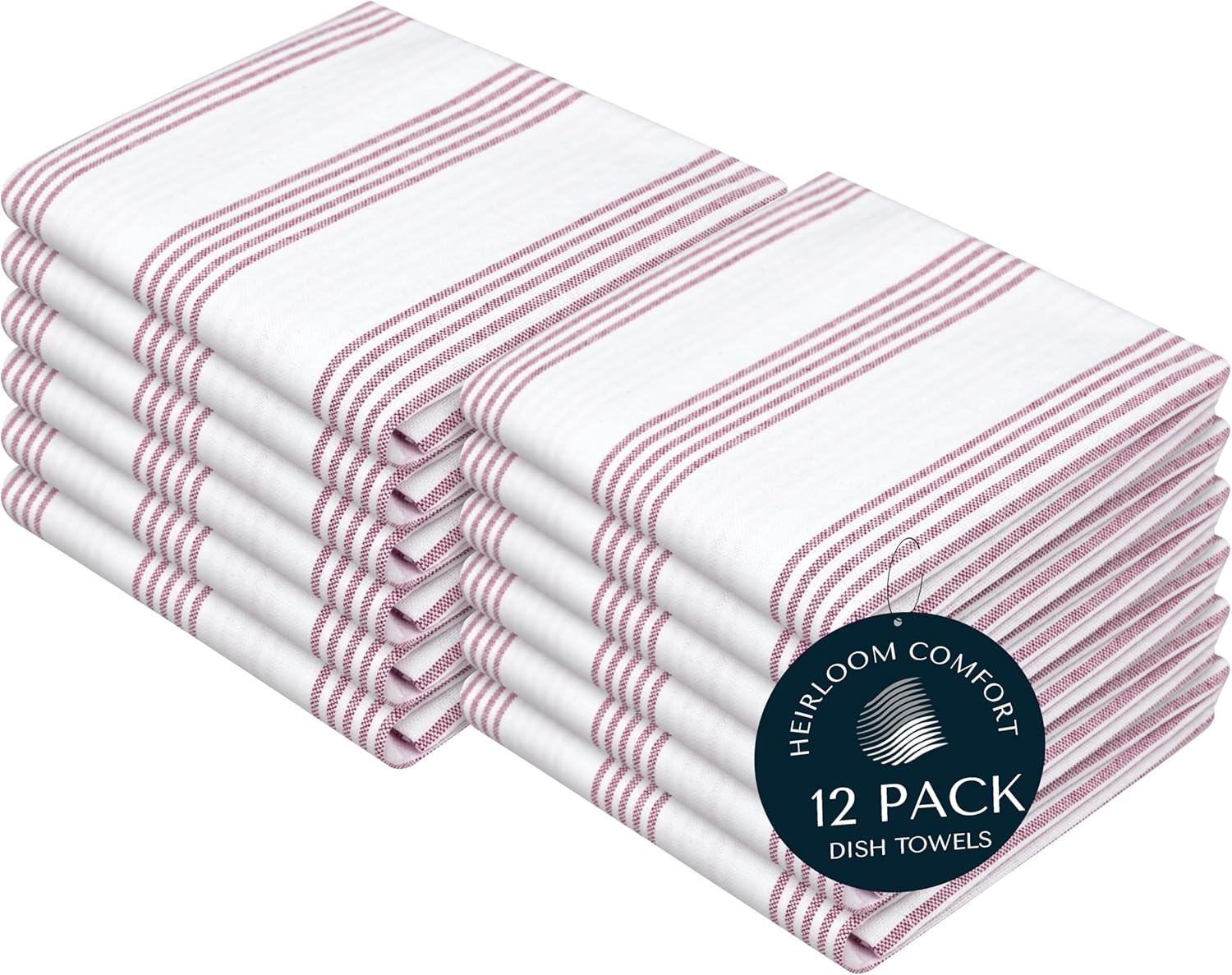 Lavender Stripe Kitchen Towels, 12 Pack, 100% Cotton, Super Absorbent and Quick Dry, Multi Pin Striped Towel Set, Durable Dish Cloths for Kitchen Use, Cleaning & Drying Dishes